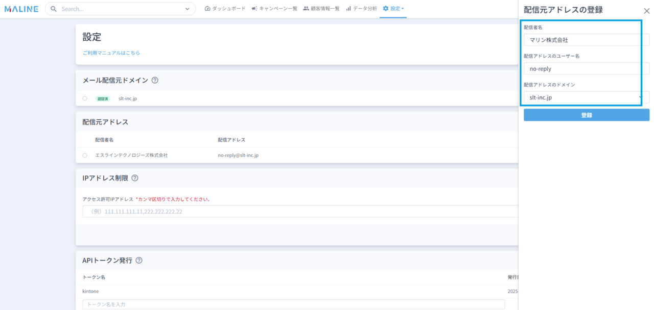 Fromアドレス(送信元アドレス)のドメインを入力し、登録ボタンを押してください。[email protected]のメールアドレスをお使いの場合、@を含めずmaline.jpのみ入力して下さい