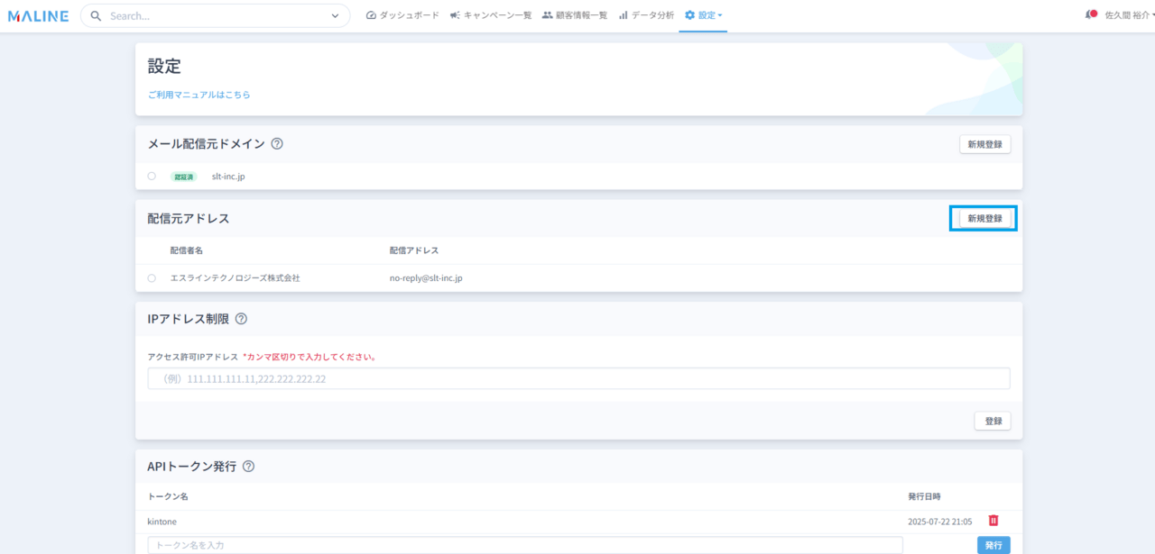 APIトークン発行とは…APIトークン発行は、MALINEと別のシステムを連携するためAPIを利用する際にユーザーやアプリケーションを識別・認証するためにご利用いただけます。